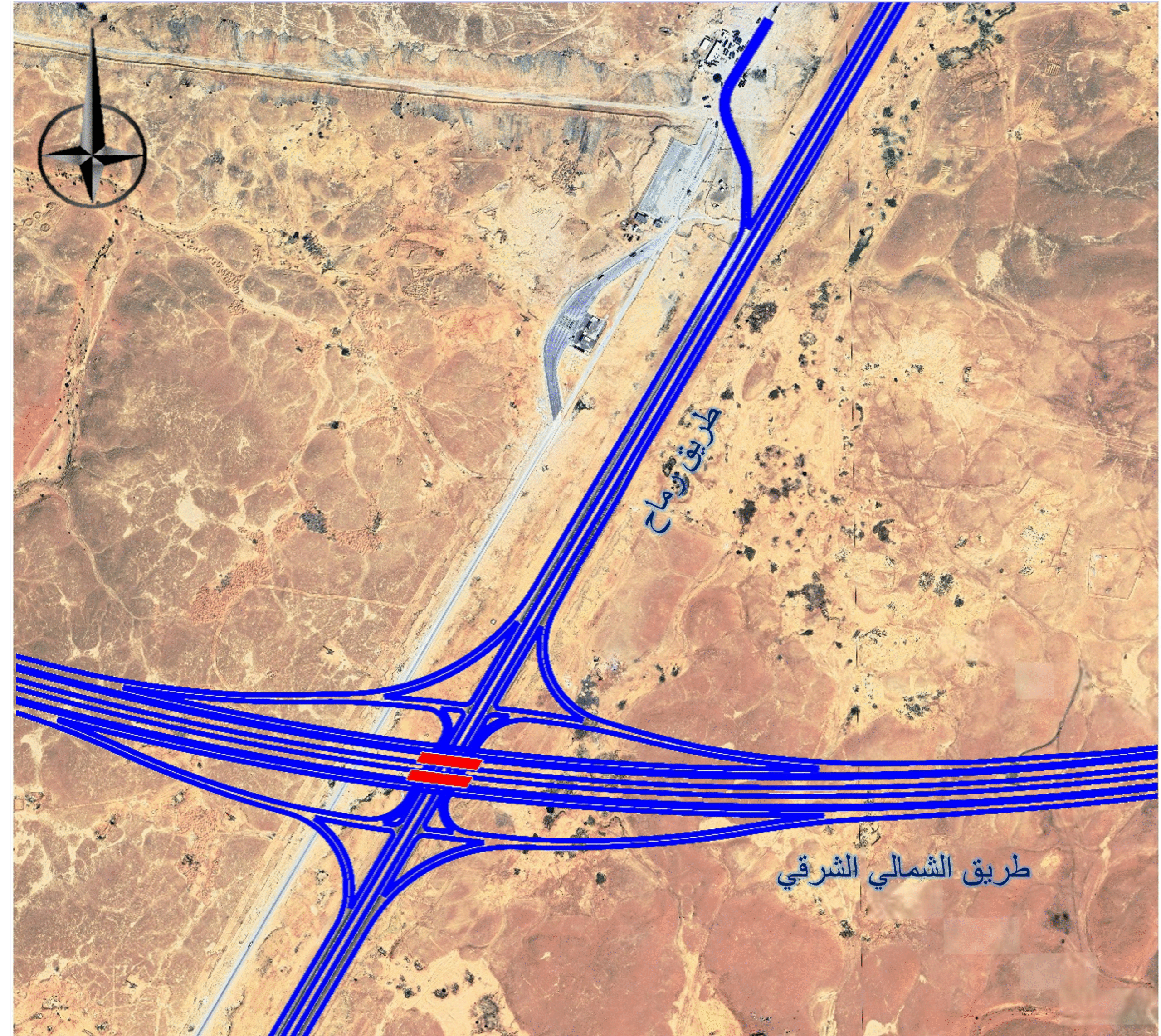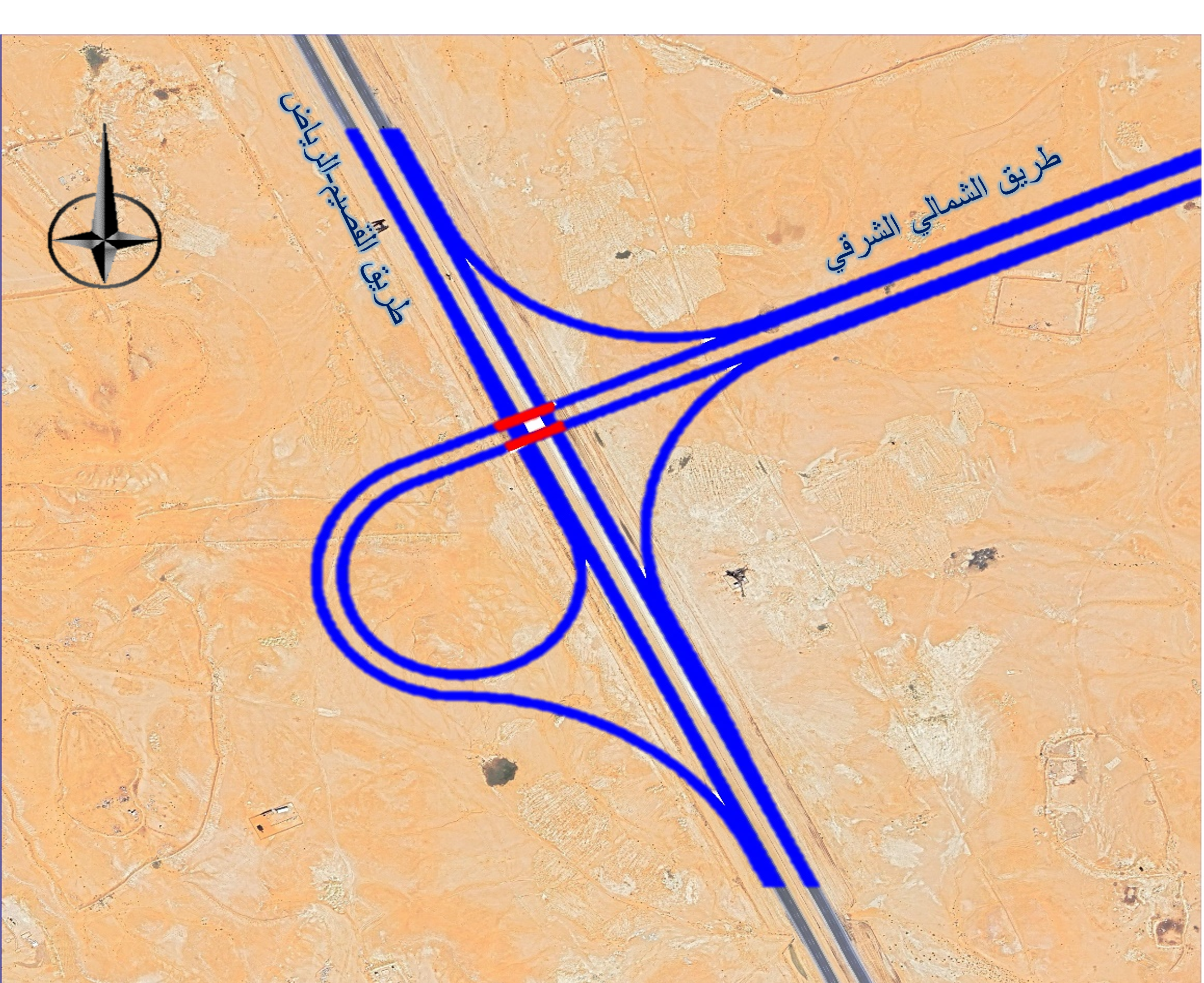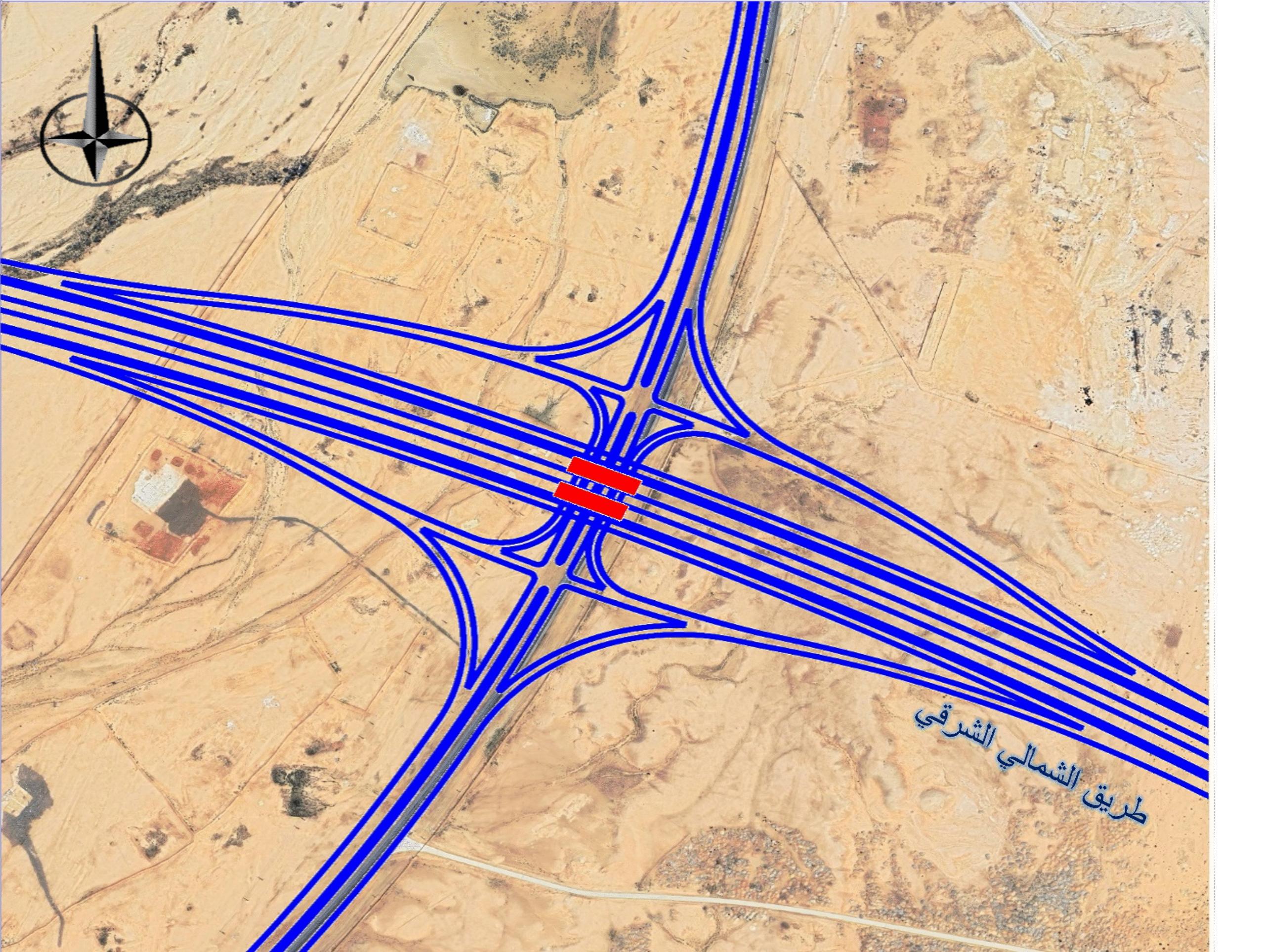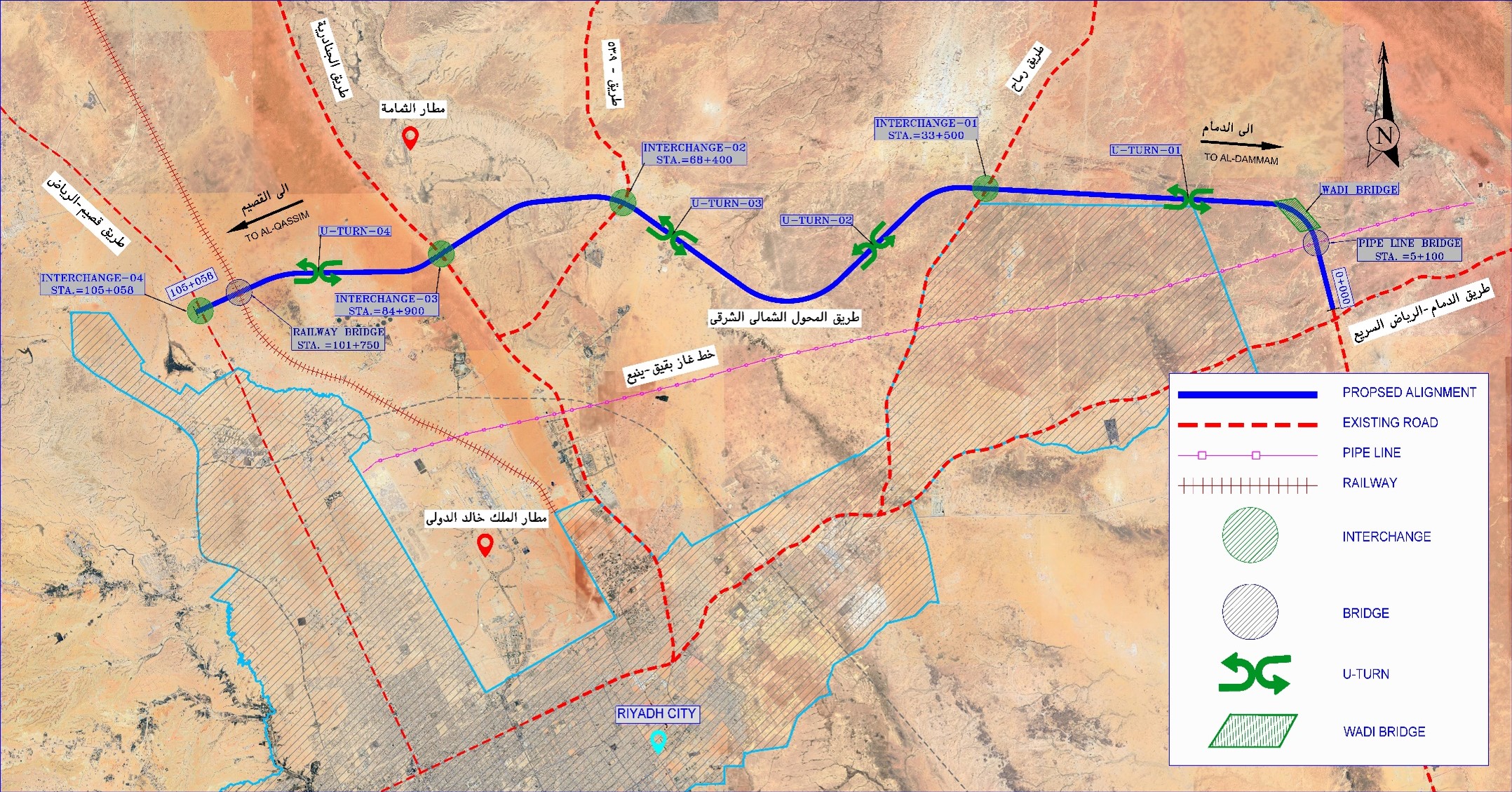 The project is strategically located in the central region of the Kingdom of Saudi Arabia, serving as a vital link to enhance connectivity and support regional development. The proposed corridor of the Northern-Eastern Bypass Road, spanning approximately 120 km, includes the design of four interchanges and multiple crossing bridges. This strategic roadway is located 21 km north of King Khaled International Airport and 45 km from Riyadh city, enhancing connectivity in the region. The corridor links the Riyadh-Qassim Road and Riyadh-Dammam Road, intersecting with key routes such as Gnadrya Road, 5309 (Romhya Road), and Rammah Road, thereby facilitating smoother traffic flow and supporting regional transportation infrastructure